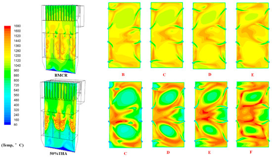 Figure 14 shows the distribution law of each burner section: from the temperature distribution law, it can be seen that there is a hot and cold angle law for the octagonal reverse double-cut circular furnace, which is consistent with the actual operation. The simulation shows that the temperature located in the center of the furnace is lower than the ambient temperature. The reason for this is that the distribution of pulverized coal particles in the center of the furnace is small, and the heat released is limited, so the temperature of the center of the section is low and the temperature is high. In the main combustion area of the furnace, a large amount of primary wind is replenished, which accelerates the ignition and combustion of pulverized coal particles and promotes the combustion and heat release of pulverized coal. Therefore, the formation of a high-temperature area and the high-speed rotation of the flue gas helps to ignite the coal powder injected into it and improve the mixing effect of pulverized coal, so the fire in this area is more easily caused and the flow field is stable. However, the front wall adhesion is more obvious.