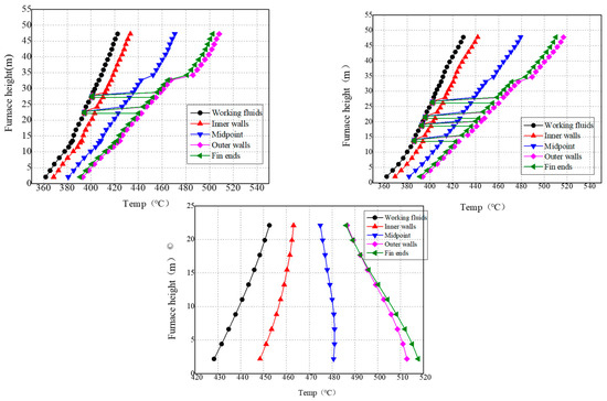 Taking the 15th circuit as an example, it can be seen that under BMCR load, the working fluid was in the single-phase zone, so the working fluid temperature increases with the increase of the furnace height, and the wall temperature also increases. The temperature point that suddenly decreases in the figure is the unheated pipe section that bypasses the burner, and the working fluid temperature, inner wall temperature, intermediate point temperature, outer wall temperature, and fin temperature coincide into one point. At the furnace height of 47.24 m, the temperature of the outer wall of the metal reaches a maximum value, which is about 516 °C. At this time, the midpoint temperature also reaches a maximum of 479.3 °C.