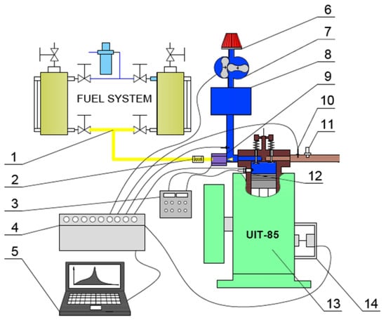 The scheme of test bench. 1-fuel supply system; 2-fuel heater; 3-electronic injection and ignition control system; 4-data acquisition card; 5-computer for real-time analysis; 6-air filter; 7-rotor flow meter; 8-air reservoir; 9-fuel injector; 10-exhaust gas temperature sensor; 11-universal exhaust gas oxygen (UEGO) sensor; 12-spark plug equipped with a piezoelectric pressure sensor; 13-UIT-85 research engine; 14-encoder on the camshaft.