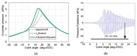 As far as the IMEP does not need any detailed explanation, the knock intensity KI was calculated as the maximum amplitude of in-cylinder pressure pulsations during the combustion phase after filtering the raw in-cylinder pressure (Figure 3a) with the high-pass Butterworth filter of 4th order and a cut-off frequency of 3.5 kHz as depicted in Figure 3b. This approach for determining knock intensity is relatively simple and therefore commonly used in research. In other papers, this parameter is named MAPO (maximum amplitude of pressure oscillations).
