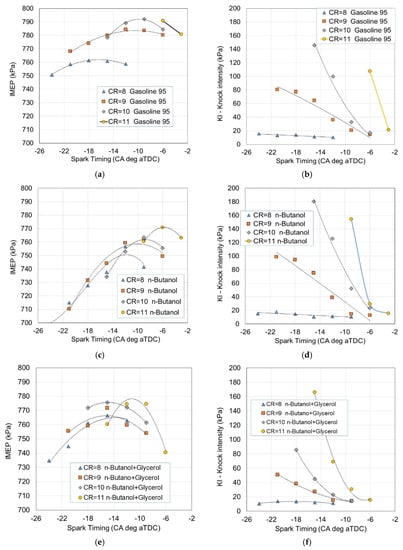 IMEP and knock intensity vs. spark timing for the tested fuels at various compression ratios: (a) IMEP for Gasoline 95; (b) KI for Gasoline 95; (c) IMEP for N-Butanol; (d) KI for N-Butanol; (e) IMEP for N-Butanol + Glycerol; (f) KI for N-Butanol + Glycerol.