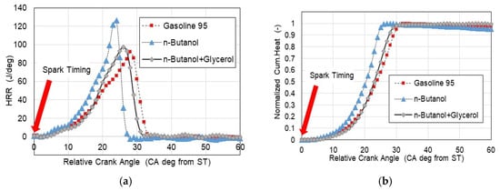 The test with a compression ratio of 10 was selected for further analysis because this one is commonly used in modern spark-ignition engines. There are several correlations of knock intensity with other combustion parameters. For example, typical combustion analysis deals with the heat release rate (HRR) (Figure 5a) and cumulative heat released from combustion recalculated to the normalized range from zero to one (Figure 5b). The representation of HRR and cumulative heat plots for comparison requires the same scale as the crank angle axis. These HRR and cumulative heat courses were calculated for the optimal spark timings, which were different for the tested fuels. Therefore, in order to make a comparison between the HRR plots, it was decided to present them by taking the spark timing as a reference point shown in Figure 5 as “Spark Timing”. Hence, the horizontal axis represents the relative crank angle and starts with “zero” from the beginning of combustion. As observed, there are no significant differences associated with the knock intensities and heat release rates for these tested fuels. The sharp peak on the butanol combustion course is caused by a so-called “rumble” effect known from gasoline combustion. One can conclude that this “rumble” effect might contribute to higher in-cylinder pressure pulsations during butanol combustion, as does knock intensity. Furthermore, as a result of higher HRR, the combustion progress is faster for N-butanol in comparison with other tested fuels, as depicted in Figure 5b.