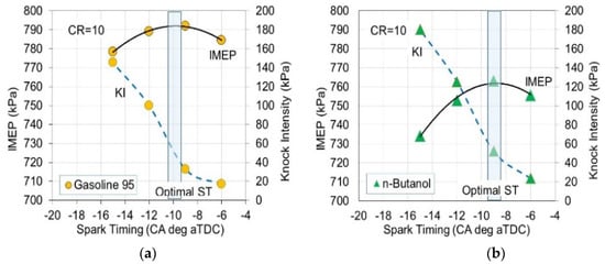 IMEP and knock intensity KI vs. spark timing for the tested fuels at a compression ratio of 10: (a) for Gasoline 95; (b) for N-Butanol; (c) for N-Butanol + Glycerol.