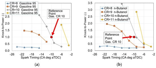 As previously mentioned in the Methodology section, a specific knock indicator Knock-to-Power was proposed that took into account, apart from the knock intensity, the engine performance expressed by IMEP. For the analysis presented here, the Knock-to-Power indicator for the operation of the engine on gasoline 95 at a compression ratio of 10 and ST = −10 generated the highest IMEP. Therefore, this indicator should be used to assess the performance and intensity of the knock occurring for an engine operating on different fuels. This approach may come as a bit of a surprise when one notices that the absolute knock value is the most significant quantity in terms of engine life. However, the knock related to engine performance (IMEP in this case), as defined by the indicator Knock-to-Power, should provide additional information of a potential for higher power with a knock occurring at a safe level that is harmless for the engine. Thus, this indicator characterizes not only the fuel (just like the index called octane number), but it illustrates the specific engine-fuel system. As shown in Figure 7, Knock-to-Power, in some conditions, exceeds a value of three. This means the relative knock intensity KIRel is 3-times higher than the relative IMEPRel referring to absolute values for KIRef and IMEPRef for gasoline at an ST = −10 CA deg aTDC at CR = 10.