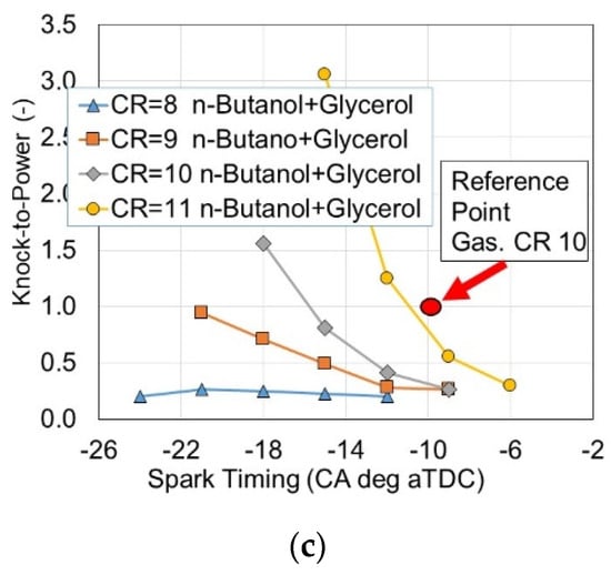 Knock-to-Power indicator vs. spark timing for the tested fuels at various compression ratios: (a) for Gasoline 95; (b) for N-Butanol; (c) for N-Butanol + Glycerol.