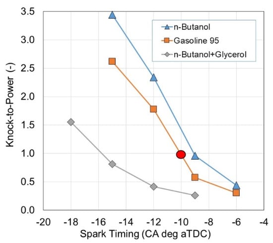 As can be seen in Figure 8, the operation of the engine on N-butanol is the most unfavorable, because, with a knocking intensity similar to that of gasoline, the engine achieves a significantly lower IMEP value, and thus lower power and lower efficiency and, consequently, lower overall efficiency. The most effective work is for the engine fueled by a mixture of butanol and glycerol. The engine achieves satisfactory performance with the relatively low Knock-to-Power indicator, as shown in Figure 8 and presented in Table 5.
