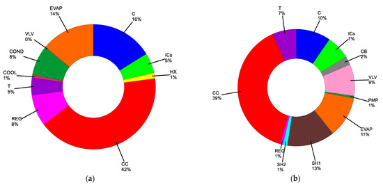Figure 3 compares the relative exergy destruction rates of the components for both systems, calculated as the exergy destruction rate in the component over the exergy loss in the plant. The irreversibilities are grouped according to the typology of the component. The main noticeable differences relate to the following: