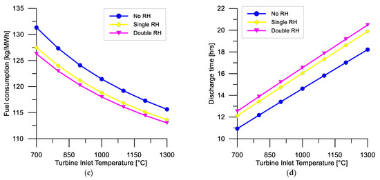 The fuel consumption per unit of energy released can also be lowered by increasing the turbine inlet temperature since the energy-discharging process becomes more efficient (Figure 4c). In particular, when the turbine was designed to operate at a temperature of 1300 °C without considering any reheater, and then the unitary fuel consumption of the plant decreased to 116 kg/MWh (blue line Figure 4c).