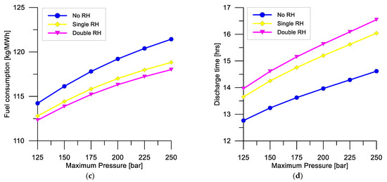 Because of the greater efficiency, fuel consumption also decreased to 117 kg/MWh for a discharge pressure of 10 bar (Figure 6c). Owing to a larger energy output per unit of fluid processed, the duration of the discharging phase also increased to 17.8 h when the discharge pressure was lowered to 10 bar (no reheating, Figure 6d).