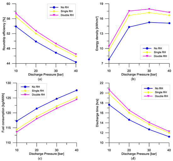 The effect of the variation of the system discharge pressure on the system efficiency and energy density is displayed in Figure 6a,b. Lowering the discharge pressure of the system allows having a higher pressure ratio across the turbine and therefore greater power output in the discharging phase. For this reason, the roundtrip efficiency increased from 44.0% up to 54.0% when the discharge pressure was lowered from 40 bar down to 10 bar (no reheating, Figure 6a).