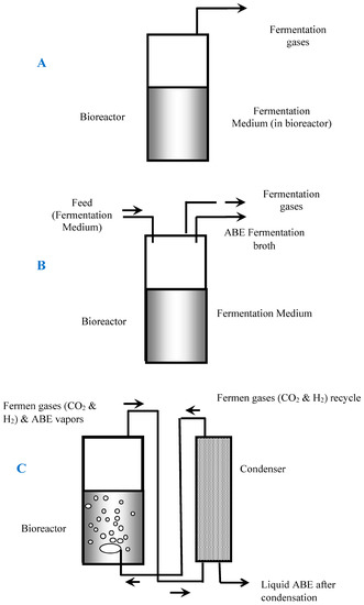 Schematic diagrams of ABE (acetone, butanol, ethanol) production from xylose employing C. beijerinckii P260. (A) Batch reactor—the reactor is filled with sugar solution prior to inoculation; (B) Continuous reactor without product recovery—the reactor is fed continuously with sugar solution and fermentation broth is removed from the reactor at the same flow rate as the feed; and (C) Concentrated sugar medium batch reactor with simultaneous product removal by gas stripping. (C) was also used to measure solvent losses through the connecting tubing. Fermen gases—Fermentation gases.
