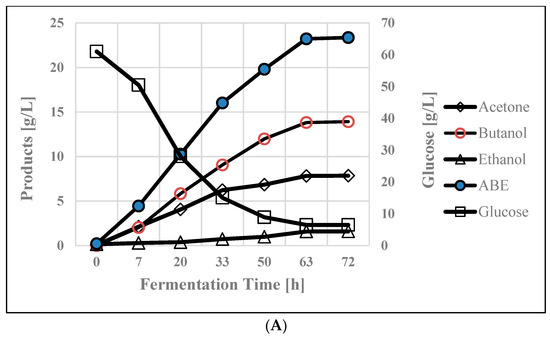 In a system like this, loss of solvents occurs in two ways: (i) with the exiting CO2 and H2 gases; and (ii) by diffusion through the connecting tube. During ABE fermentation, a significant amount of gases are produced that carry ABE through the exit line. On a mass balance, over 50% carbon is lost due to its conversion to CO2. Based on a previous study [35], the losses that occurred in this system (150 g/L xylose) were quantified to be 28.65 g. A schematic diagram of quantification of ABE losses is shown in Figure 1C and a method or description has been given in the Materials & Methods Section 2.4.