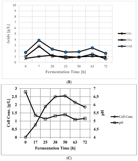 A control ABE batch fermentation was operated with 61.0 g/L glucose in the bioreactor. This substrate (glucose) is an ideal feedstock for ABE fermentation [28,29]. The fermentation was run for 72 h and during the course of fermentation 23.40 g/L ABE was produced using 54.5 g/L glucose (Figure 2A). This resulted in an ABE yield of 0.43 g/g. At the end of fermentation 6.5 g/L glucose remained unused. In this fermentation, an ABE productivity of 0.33 g/L·h was obtained. The microbial strain produced 3.85 g/L total acids during the early stage of fermentation, which were partly utilized during fermentation (Figure 2B). At the end of fermentation, 1.57 g/L acids remained unused. The individual amounts of acetic and butyric acids were 0.62 and 0.96 g/L, respectively. During fermentation, approximately 2.55 g/L dry cell mass was produced (Figure 2C). The initial pH of the medium was 6.8, which decreased to 5.09 to 5.15. In the solventogenic stage, the microbial strain regulated its own pH.