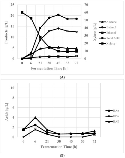 Following the control, a fermentation with 60.0 g/L initial xylose using C. beijerinckii P260 was performed. The fermentation was run for 72 h and an ABE concentration of 18.44 g/L was observed (Figure 3A), resulting in a productivity of 0.26 g/L·h. This productivity is 21% lower than glucose fed reactor’s productivity. At the end of the fermentation, 9.80 g/L xylose remained unused (Figure 3A). In this fermentation an ABE yield of 0.40 g/g was achieved. This suggested that in a batch fermentation, this strain can effectively ferment xylose. Production and assimilation of acids are shown in Figure 3B. At 6 h of fermentation, the culture accumulated 3.98 g/L acetic and butyric acids, which were partly utilized by the culture. At 45 h, the total concentration of acids in the fermentation broth was 0.66 g/L. At the end of fermentation, a cell concentration of 2.1 g/L was measured.