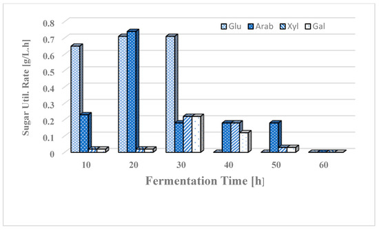 When using lignocellulosic sugars such as glucose, xylose, arabinose, and galactose, two parameters are of utmost importance: (i) simultaneous use of hexose and pentose; and (ii) rate of utilization of the sugars. To investigate this, an experiment was performed where 15 g/L each of these four sugars was included in the medium [35]. It was noticed that glucose utilization was faster than other sugars. The results on the rates of sugar utilization are compared in Figure 4. At this stage, it is not clear why the strain preferred to use arabinose as compared to xylose as they both are pentose sugars.