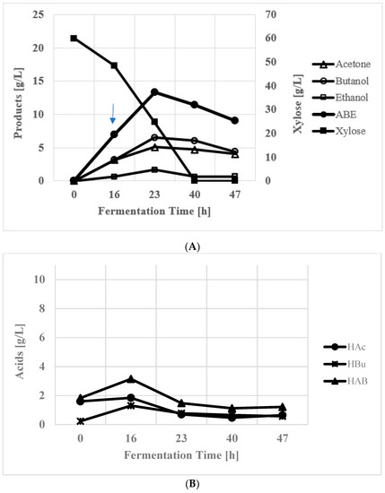 Production of ABE from xylose and simultaneous product recovery in a batch reactor using C. beijerinckii P260. (A). Products and xylose at various fermentation times; (B) Concentration of acids at different fermentation times. The arrow indicates the time when product recovery was initiated. Abbreviations as in Figure 2.