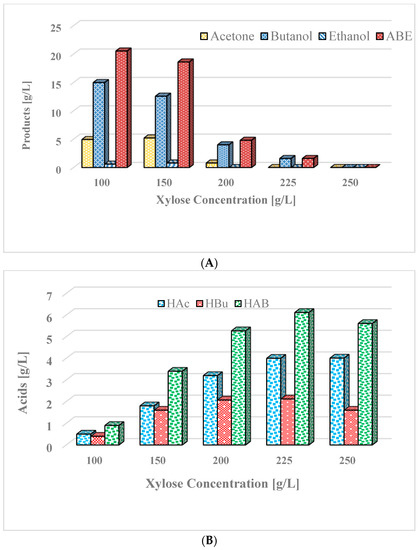 Next, in order to observe the effect of osmotic stress associated with high concentrations of xylose on the microbial strain, fermentations were conducted with 100 to 250 g/L initial xylose (Figure 6A). At 100 and 150 g/L xylose, 20.41, and 18.89 g/L ABE were produced, respectively. Increasing sugar concentration further (200 and 225 g/L) severely inhibited ABE production. At these sugar concentrations, 4.79 and 2.79 g/L ABE were produced, respectively. At a sugar concentration of 250 g/L, poor cell growth occurred, and no ABEs were produced. Acid production at various initial xylose concentrations is presented in Figure 6B. At 100 g/L initial xylose concentration, total acid production was 0.55 g/L. At sugar concentrations of 200 and 250 g/L, 5.36 and 5.30 g/L total acids were produced, respectively.