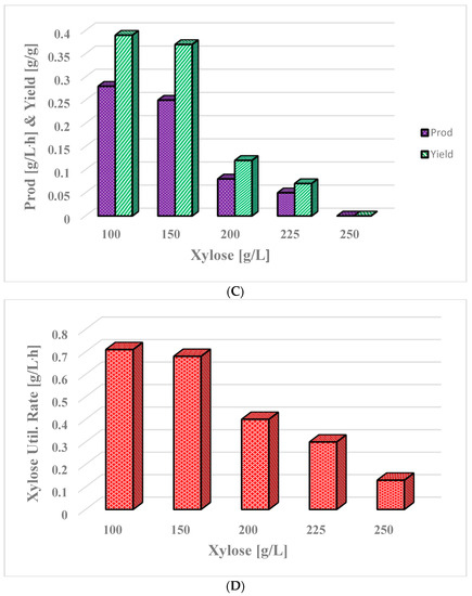 Production of ABE from concentrated xylose (100–250 g/L) in batch fermentations using C. beijerinckii P260. (A) Xylose concentration vs Products; (B) Xylose vs Acids; (C) Xylose vs Productivity and Yield; and (D) Xylose utilization rate during fermentations. Abbreviations as in Figure 2. Prod—productivity; Util.—utilization.