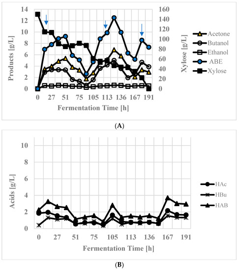 At 168 h, when the unfermented xylose concentration was 34.97 g/L, the reactor was fed with nutrients (yeast extract 1 g/L and stock solutions 10 mL/L) and the whole culture was reinoculated with fresh inoculum. Prior to inoculation and supplementation with nutrients, the cell mass was removed by centrifugation. Gas stripping was started again at 174 h. By 191 h, the culture had utilized all the sugar. The organic acids production profile for the fermentation is shown in Figure 7B. In Figure 7A,B, the fluctuations in solvents and acids concentrations are seen. These fluctuations in product concentration occur due to varying active cell mass concentration. In butanol or ABE fermentation, four types of cell mass exist and they are known as the active solventogenic cell mass that produces ABE, cell mass that supports cell growth, cells that neither support ABE production nor cell growth but require maintenance energy, and dead cell mass [37]. They are characteristic of ABE fermentation and such fluctuations have been reported previously [38]. The amounts of condensates at various times are presented in Table 3.