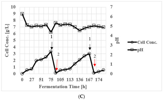 Production of ABE from 150 g/L xylose medium in an integrated fermentation product recovery system by gas stripping using C. beijerinckii P260. (A) Products and xylose concentrations during fermentation (arrows indicate the times (16, 113, and 174 h) when product recovery was initiated); nutrients were added at 0, 92, and 168 h; (B) Fermentation times vs acids. (C) Fermentation time vs cell concentration. Conc.—concentration. 1 & arrow indicate when cell mass was removed by centrifugation and 2 & arrow indicate when the reactor was inoculated and nutrients were added to the reactor.