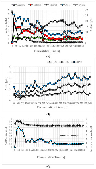 Production of ABE from xylose in a continuous bioreactor fed with xylose as a substrate employing C. beijerinckii P260. (A) Fermentation time vs products and xylose. (B) Fermentation time vs acids; (C) Fermentation time vs dry cell concentration and pH. Conc.—concentration. Abbreviations as in Figure 2.