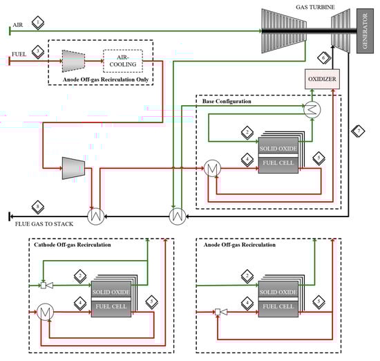 The base configuration is the simplest configuration and does not use any SOFC off-gas recirculation. In this design, ambient air is compressed in the GT compressor and pre-heated against the GT exhaust gas (as much as possible at 90% exchanger effectiveness) as well as the SOFC cathode off-gas to reach a SOFC inlet temperature of 700 °C. To reach the SOFC inlet pressure of 5 bar on the fuel side, the incoming RH