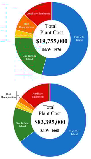 When moving from 10 MW to a 50 MW scale, the TPC increases by a factor of 4.2 (less than 5.0 due to the economics of scale as described by Equation (17)) to USD 83,395,000. However, due to the modular nature of fuel cells, cost savings related to the SOFC island are small leading to an increase in the relative cost contribution of the SOFC island as seen on the bottom of
