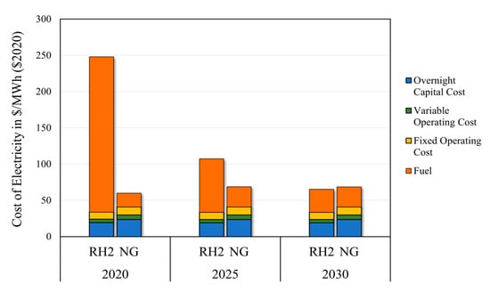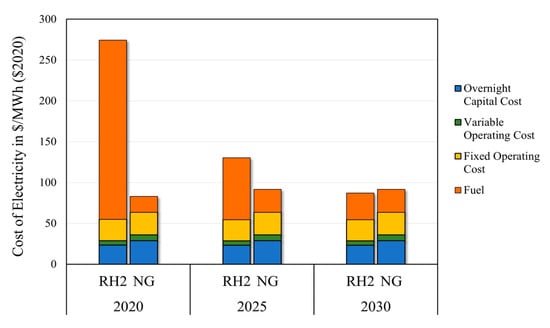 After identifying the anode recirculation case as the thermodynamically most favorable configuration, an economic analysis is conducted to gauge its competitiveness in the energy market. The cost analysis provides key economic performance metrics, such as specific plant cost and cost-of-electricity, for a n-th plant SOFC–GT hybrid system fueled by RH2. Furthermore, the RH2 system is compared to a NG-fueled SOFC–GT hybrid considering pre-pandemic 2020 fuel costs as well as price projection for the years 2025 and 2030. The analysis is conducted in real 2020 USD.