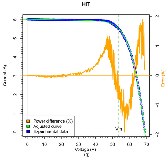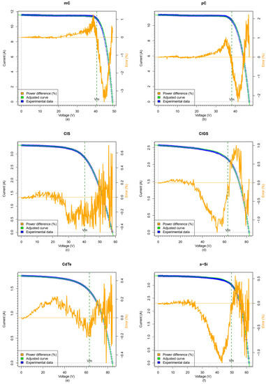 Figure 3e displays the CdTe module, as mentioned earlier. The fitting achieves an accuracy of under ±0.5% for the majority of the curve, indicating excellent performance in the adjustment process. However, there is still some presence of electrical noise, particularly noticeable in the VOC region. Nevertheless, we can confidently state that the adjustment was successfully applied along the entire I–V curve and accurately located the PM point.