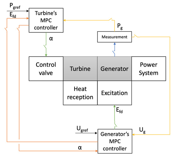 In the system of concern, a turbo–generator set, there exists an internal interaction: the turbine and the generator are connected by a common shaft on which they are mounted. The way in which they interact results from the values of mechanical moments: the drive torque of the turbine and the operating torque of the generator. The resultant value of these interactions is the rotational speed of the shaft. Increasing the electrical load on the generator causes an increase in the electromechanical torque, a load on the turbine. Any changes in the mechanical torques of the turbine and generator affect the rotational speed of the turbine–generator set. At the same time, the value of the rotational speed of the shaft causes disturbances in the generator’s voltage. Both components of this system, the turbine and generator, usually have two separate controllers. In previous works, it was proposed to use the aforementioned MPC controllers and a communication channel between the controllers, forming a distributed control system, which is intended to better facilitate the prediction of the object’s behavior and thus increase the quality of control.