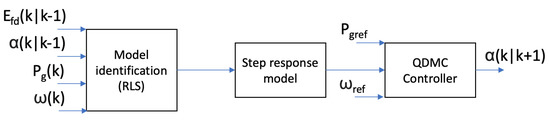 For the purposes of implementing the control algorithms, input–output models describing the dynamics of the turbine–generator set were used, the parameters of which were updated at each simulation step using the recursive least squares method. The RLS algorithm enables the determination of an unknown model’s parameters based on a set of input and output measurement data [31]. The RLS algorithm was chosen due to the simplicity of calculations, ease of implementation for the estimation of the parameters of the online model, and the possibility of taking into account the past input and output values of the object (as opposed to, e.g., the gradient method). Subsequently, based on the identified simplified model, a nonparametric step response model is determined for the proposed QDMC control system described in this paper (or an alternative algorithm such as DMC [28]). The sample use of a step response model can be easily traced in the literature: see [32]. The article proposes the adaptation of the parameters of the online model to the operating point of the object using the recursive least squares method. Solutions based on a set of soft-switch models (e.g., fuzzy model [33]) defined for specific operating points are characterized by worse accuracy at intermediate points between these points as all the values are the average of the two neighboring points. In the case of nonlinear systems, it does not have to always be true. In this case, the model output is a combination of the object linear model outputs for adjacent work points and may deviate from the nonlinear model output. Therefore, it is proposed to use the mechanism of adapting parameters of online models. This approach allows the minimization of the modeling error for a wide range of changes in the operating point.
