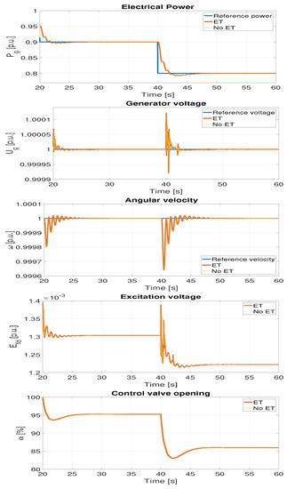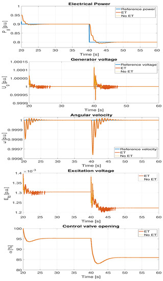 The third experiment was performed using the original triggering conditions, ensuring the correct system operation in different operating conditions. In order to show the increase in the frequency of communication depending on the regime in which the turbine set operates, the frequency of changes in the set value of active power was increased to 2 s. Thanks to this, in the presented simulation period of 40 s, the number of changes in the set value was increased from 2 to 20, forcing more frequent communication. The obtained results are presented in Figure 10 and Table 6. As in the case of the experiment with the slower pace of the set trajectory of active power change, both systems (with and without ET) behave identically. No significant deterioration in quality was observed. These results are also confirmed by the integral quality indicators.