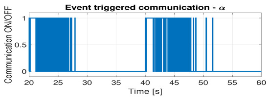 Figure 11 and Table 7 show the triggering time of the information exchange in both communication channels ( and ) and the ratio of the time in which the communication occurred to the total time of simulation. As expected, the significant increase in the dynamics of the setpoint change led to a greater need for information exchange. Therefore, the control systems communicated more often, which significantly affected the percentage of communication time. This illustrates how changing the test scenario affects the effectiveness of the ET solution. Nevertheless, even in such a demanding case, the use of event triggering technology allows you to limit the amount of information sent over the network.