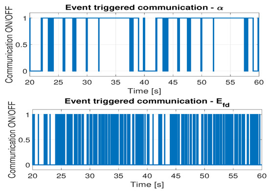 Additionally, Figure 6 shows the communication/no communication signal for one-way communication, while Figure 7 shows the same for two-way communication. Value 1 marks the time instants when the communication occurs and 0 marks the instances with no communication for two signals exchanged between the control systems: the control valve opening and excitation voltage . Table 3 shows the percentage of time in which the communication occurred and the time with no communication.
