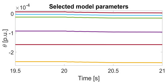 In addition, the parameters obtained by the RLS algorithm for the system with and without event-triggered communication were compared (event-triggered and time-triggered). Table 8 shows sample results for the generator model (21 parameters) obtained during the experiment discussed above. Figure 12 shows a few of the parameters changed by the RLS algorithm during the time after the change in the plant’s operating point (step change of the set active power) in the 20th second of the simulation.