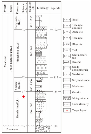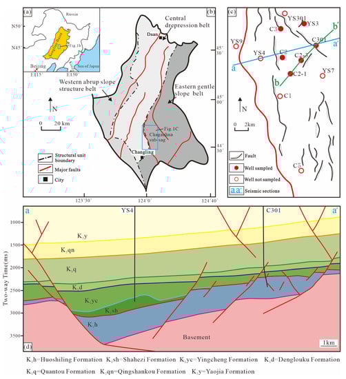 The Songliao Basin is located in northeastern China and is developed on top of the Garridon-Haixi phase fold belt between the southern margin of the Siberian plate and the northern margin of the North China plate [41] and is a hydrocarbon-bearing basin with a double-layered structure of a Middle to Late Jurassic–Early Cretaceous fault and an Early Cretaceous depression [42]. During the Late Jurassic–Early Cretaceous, the Palaeo–Pacific plate subducted towards the NE land mass, producing NW–SE-oriented tensioning and forming numerous fault traps, which extended mostly in the NNE and NW directions [43]. The Changling fault depression is located in the southwestern part of the central depression zone of the Songliao Basin, with a distribution area of approximately 7240 km2, which is the largest depression in the southern part of the Songliao Basin [43,44]. The Changling Depression can be divided into three secondary tectonic units: the Central Depression Zone, the Western Steep Slope Zone, and the Eastern Gently Sloping Zone [45] (Figure 1a,b). The Lower Cretaceous Huoshiling Formation (K1h), Shahezi Formation (K1sh), and Yingcheng Formation (K1yc) were mainly developed during the faulting period of the Changling fault depression, which is characterized by sedimentary filling, simultaneous superposition of multiple eruptions of volcanic rocks, and late modification [46] (Figure 2).