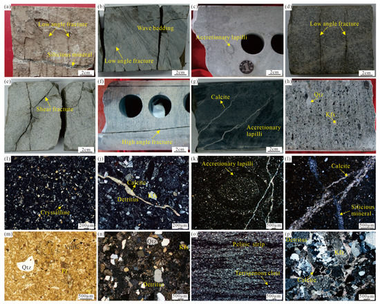 Petrographic characteristics of subaqueous pyroclastic rocks of the Chaganhua subsag, Huoshiling Formation. (a) Fine-grained crystalline tuff, low-angle fracture, high-angle fractures filled with siliceous minerals, Well C2, 4417.70 m; (b) Fine-grained crystalline tuff, bedding, low-angle fracture, Well C301, 4035.60 m; (c) Coarse-grained crystalline vitric tuff, accretionary lapilli, Well C3, 4627.90 m; (d) Coarse-grained detritus crystalline tuff, low-angle fracture, Well C2, 4417.70 m; (e) Tuffaceous sandstone, shear fracture, Well C301, 4047.00 m; (f) Fine-grained crystalline tuff, high-angle fracture, Well C2, 4563.10 m; (g) Sedimentary tuff, accretionary lapilli, fractures filled with calcite, Well C2-1, 4542.20 m; (h) Tuffaceous sandstone, Well C3, 4526.33 m; (i) Fine-grained crystalline tuff, Well C2, 4422.12 m; (j) Coarse-grained crystalline tuff, fractured Well C2, 4781.80 m; (k) Fine-grained crystalline tuff, accretionary lapilli, two-stage fractures filled with calcite, Well C3, 4627.90 m; (l) Sedimentary tuff, two-stage fractures filled with calcite and siliceous minerals, Well C2-3, 4226.35 m; (m) Coarse-grained crystal vitric tuff, Well C3, 4624.80 m; (n) Coarse-grained detritus crystalline tuff, Well C2, 4417.70 m; (o) Sedimentary tuff, pelitic strips, Well C2, 4778.3 m; (p) Tuffaceous sandstone, calcite cement, Well C3, 4526.3 m. Qtz = quartz, Kfs = K-feldspar, Pl = plagioclase.