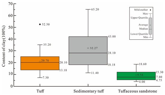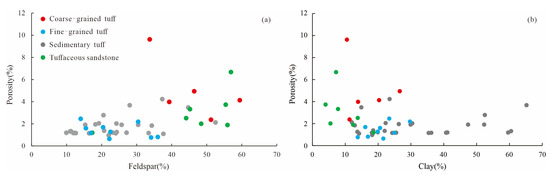 Through the analysis of the cast thin sections and SEM surface porosity, combined with the measurement of porosity and permeability, it was found that tuff is the most favorable type of reservoir, and the coarser the granularity of the pyroclastic particles, the more favorable the reservoir the physical properties, and the larger the pore size, and the higher the porosity (Figure 10). Tuffaceous sandstone is the next most favorable type of reservoir, and the physical properties of sedimentary tuff reservoirs are the least favorable (Figure 7). The mineral composition of volcanic rock is closely related to its porosity. In general, porosity is negatively correlated with clay mineral content and positively correlated with feldspar content (Figure 11).