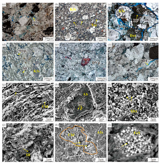 Tuff is formed by the consolidation and compaction of volcanic ash, and volcanic glass is an extremely unstable component formed during rapid cooling of magma [59]. During the burial process, strong devitrification occurs with changes in time, temperature, and pressure [60,61,62,63,64,65]. When there is an aqueous medium, after hydrolytic devitrification, some of the components are lost with the pore water, and the remaining components are recrystallized and transformed into crystals or microcrystals. The formation process of devitrification includes a series of geochemical effects, such as dissolution–precipitation of volcanic glass, recrystallization, and migration and transformation of metal ions [66,67], and the volume of the newly formed minerals are smaller, thus forming a large number of micropores between different minerals [68,69,70,71]. Devitrification pores can account for approximately 70% of all types of pores in tuffs [68]. The intergranular pores formed by devitrification of pyroclastic rocks in the study area are mainly located between quartz and feldspar grains and are clearly visible under SEM (Figure 5i). The devitrification pores developed in continuous slices in the cast thin section in Figure 5e have a star shape.