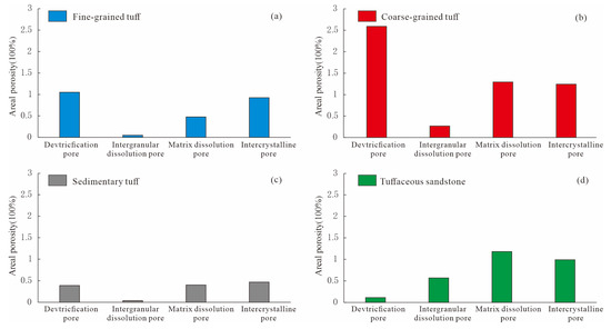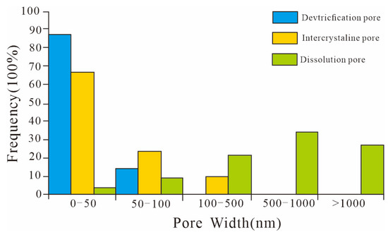 In this study, the surface porosity of 65 cast thin sections and 24 SEM samples were studied, and the main pore size distributions of different types of pores were calculated, as shown in Figure 6. Devitrification pores and intergranular pores could be observed by only SEM, and the diameters of most devitrification pores and intergranular pores are less than 50 nm. The pore size distribution range is very wide, and the sizes of the dissolution pores are mainly distributed between approximately 100 and 1000 nm, showing intragranular and matrix dissolution. The reservoir space of tuff mainly consists of dissolution pores, devitrification pores, and clay mineral pores. The reservoir space of sedimentary tuff is mainly composed of intergranular pores with clay minerals and a few dissolution pores. The reservoir space of tuffaceous sandstone mainly consists of dissolution pores and a few clay mineral pores.