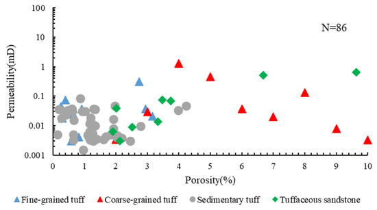 In this study, 86 rock samples were selected for porosity and permeability tests, and the analysis results showed that the porosity ranged from 0.15% to 6.71%, with an average value of 2.43%, and that the permeability distribution ranged from 0.0011 to 0.646 mD, with an average value of 0.076 mD (Figure 7). The physical properties of the reservoir are closely related to the lithology. Coarse-grained tuffs and tuffaceous sandstones generally have porosities greater than 2%, while the majority of sedimentary tuffs have porosities less than 2%, and there is little difference in permeability between reservoirs of various lithologies. The physical properties of volcanic reservoirs vary greatly with different lithologies, and the main types of reservoir space are also different. Moreover, the distribution range of physical properties of the same lithology is relatively wide, indicating that lithology is an important factor controlling reservoir distribution. In addition to the lithology, the reservoir physical properties are affected by other factors. According to the reservoir classification standard of SY/T 6285-2011 [81] “Oil and Gas Reservoir Evaluation Method”, the pyroclastic reservoir of the Huoshiling Formation is a low-porosity and low-permeability reservoir.