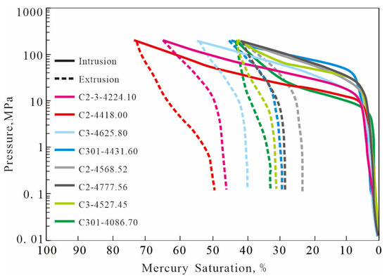 The reservoir spaces of the tuff reservoir samples (C2-3-4224.10, C2-4418.00, C3-4625.80) are mainly dissolution pores and devitrification pores. Graphically, the capillary pressure is curved and almost platform-free and sloping, indicating a complex pore structure and poor sorting in the core (Figure 8). The pore size distribution is concentrated in the range of approximately 100 nm to 20 μm, with a median pore throat radius of 0.013 μm, and the pores are predominantly coarse pores, with an overall micro- to nanoscale. The expulsion pressure is 8.259–13.772 MPa, the median mercury saturation pressure is 54.58–170.83 MPa, the maximum incoming mercury saturation is high, and the average mercury removal efficiency of the core is 29.57%, which is due to the complex pore structure of the reservoir and the significant differences in the distribution of pores and throats. The large amount of mercury retained in the pores is caused by the shielding effect of small pores. The hysteresis loop shapes mainly fall between the H2 type and H3 type (Figure 9a–c), indicating that both microspherical pores and some narrow pores or fractures exist in the nanoscale pore space of these samples. Tuffs with high volcanic glass content are prone to form nanoscale devitrification pores with a shape similar to spherical pores under devitrification action, and slit pores can be formed due to the dissolution of minerals and as intergranular pores of clay minerals. The pore volume of the coarse-grained tuff is large, but the number of pores is relatively small, since there are dissolution pores and intergranular pores with large pore sizes. The formation of clay minerals divides the large intergranular pores into multiple micropores, the pore size decreases abruptly in the part of the rock enriched with clay minerals, and an “ink bottle”-shaped pore combination can be formed.