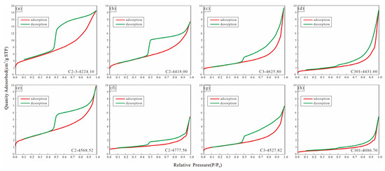 N2 adsorption and desorption isotherms obtained from the LTNA experiments. (a) Well C2-3, 4224.10 m, coarse-grained brecciated crystalline tuff; (b) Well C2, 4418.00 m, coarse-grained detritus crystalline tuff; (c) Well C3, 4625.80 m, coarse-grained vitric crystalline tuff; (d) Well C301, 4431.60 m, fine-grained crystalline tuff; (e) Well C2, 4568.52 m, sedimentary tuff; (f) Well C2, 4777.56 m, sedimentary tuff; (g) Well C3, 4527.82 m, tuffaceous sandstone; (h) Well C301, 4086.70 m, tuffaceous sandstone.