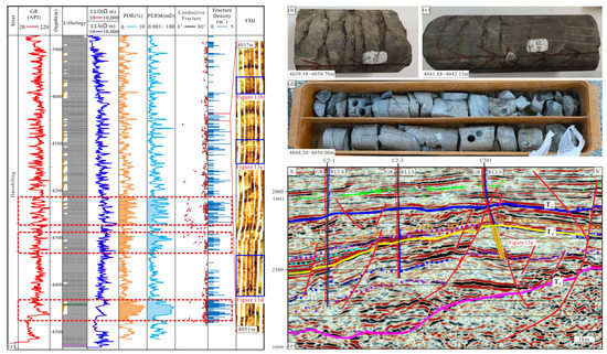 Fracture development characteristics (example of Well C301). (a) Fracture characteristics of the comprehensive columnar section from Well C301; (b) Low-angle fractures, Well C301, 4039.58–4039.70 m; (c) Low-angle fractures, Well C301, 4041.88–4042.13 m; (d) Low-angle fractures and shear fractures, Well C301, 4048.20–4050.00 m; (e) Characteristics of the seismic profile along the b-b′ line in the study area (profile position is shown in Figure 1b).