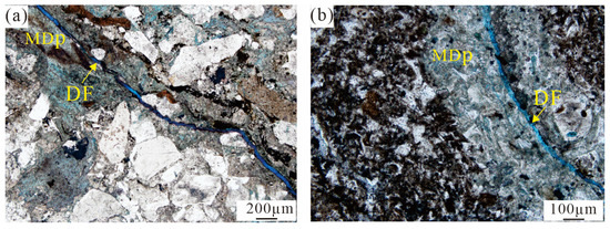 Dissolution fractures in thin sections of pyroclastic rocks in the study area. (a) A dissolution pore develops near the fracture, Well C3, 4527.42 m; (b) Dissolution pores are distributed along the fracture, Well YS3, 4329.30 m. DF = dissolution fractures, MDp = matrix dissolved pore.