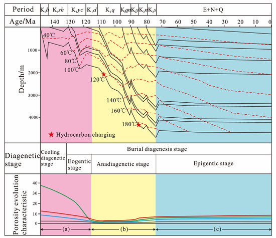 The porosity evolution of pyroclastic rocks in the study area can be divided into three stages: the porosity decreasing stage caused by normal compaction, the porosity increasing stage caused by devitrification and dissolution, and the porosity stability stage after tectonic uplift. From the perspective of burial history and thermal evolution history, the three stages occurred before the deposition of the Denglouku Formation, between the deposition of the Denglouku Formation and Sifangtai Formation, and after the deposition of the Sifangtai Formation (Figure 15).