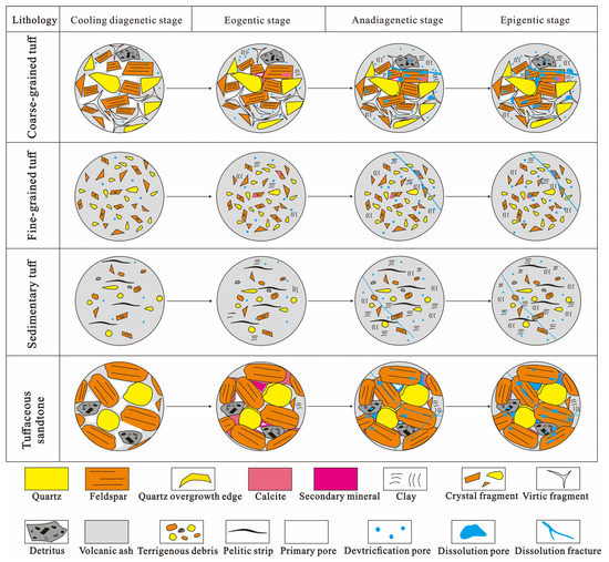 Subaqueous pyroclastic rocks have certain peculiarities due to their large number of unstable components, short transport distances, and rapid consolidation into rock, combined with regional tectonic movements and the influence of stratigraphic fluids, resulting in pyroclastic reservoirs that are different from normal volcanic rocks and normal sedimentary rocks [40]. The pyroclastic reservoirs have undergone formation, modification, destruction, and remodeling. The most important mechanisms affecting the formation of pyroclastic reservoirs in the Huoshiling Formation of the Chaganhua subsag are devitrification, dissolution, and tectonic movement.