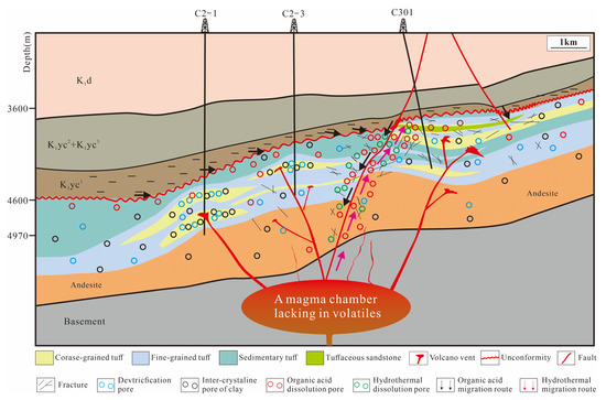 The pyroclastic rocks of the Huoshiling Formation in the Chaganhua subsag and the source rocks of the Yingcheng Formation interlock laterally [50]. The organic acids produced in the burial process and the unstable minerals produced by deep hydrothermal circulation are the main reasons for the formation of dissolution pores in the study area. Matrix dissolution pores are mainly developed in the matrix of the volcanic ash, and micropores are formed by the dissolution of fine crystalline chips and detritus in the volcanic ash. The dissolution pores developed in the pyroclastic rocks of the Huoshiling Formation in the Chaganhua subsag are mainly feldspar dissolution pores (Figure 5h,k). Minerals such as aluminosilicate formed by devitrification of volcanic glass dissolved in the presence of acidic fluid, thus producing dissolution pores; for devitrification pores or altered pores, further dissolution produces dissolution pores (Figure 5d,e). Therefore, the pores observed in the study area are mostly the combination of devitrification pores and dissolution pores.