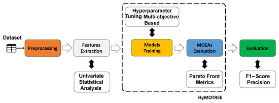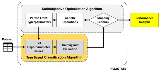 The proposed approach focuses on maximizing the model performance by searching for and adjusting the hyperparameters (HPs). The hypertuning is based on two MOEAs: the evaluation metrics of multiobjective and tree model-based algorithms. The HPs are values that cannot be estimated directly by the model and are usually adjusted before training. The search for HPs aims to adapt the classifiers to the dataset used in the training process, improving the model’s performance. Grid Search and Random Search are the most used algorithms to search for the best combination of HPs. However, both algorithms require a high time cost based on exhaustive searches.