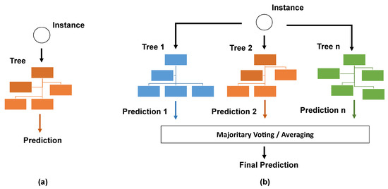 The DT algorithm generates simple and intuitive classifiers since its entire structure is based on a single tree, as shown in Figure 3a. In this way, the computational cost demanded in model training is very low [26]. The DT algorithm’s great advantage is its lower propensity for overfitting, which is a condition in which the model learns the training dataset so well that it performs poorly on unseen datasets [27]. On the other hand, its performance may not be adequate when the data are more complex, causing underfitting patterns [28]. This phenomenon occurs when few predictors are included in the model, representing poorly the data pattern and affecting its performance and its generalization ability negatively [27].